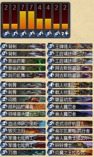 核心卡:盗贼的背刺刺骨军七毒药乱舞,5个身材好的食人魔,后期三个七攻击以上大哥,就是被王牌吃的。。。