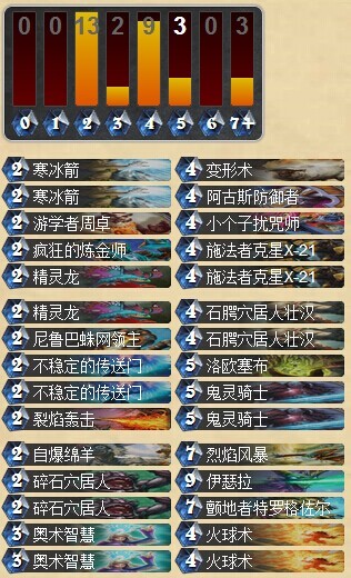 伊瑟拉*1:整套卡组四张过牌,打到后期手牌不足的时候,可以起到补充手牌的作用,4/12不容易被秒,牧师永恒的伤,(打到10费还有缩小工程师?哥们你认命吧)梦境牌张张强力,欢笑姐妹终于能和鬼灵骑士一家团聚了!出其不意,炼金师12/4,上去一个嘴巴!就是酸爽!