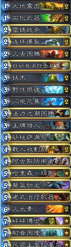 卡组解析:这套卡组曲线合理,失败的理由一般只有2个~起手太差或则对手神抽~起手需要保留3费和3费以下的卡最少1张(其中不包括妖术);新版本的连环爆裂几乎完胜闪电箭没理由不带,低费嘲讽卡之前用的是驱魔师,面对术士和猎人有很好的作用,倾向于防御,但是狼魂更好配合火舌更有侵略性;自动漩涡打击装置很暴力,但是带2张不如带上一张雷铸战斧更灵活(都带上中期乏力),443全卡组必带(给个不带的理由?)沙锤萨满代替的另外一张自动漩涡打击装置,乱打乱发财,对手10有89用法术或则仆从强解(虽然只有在对面空场的时候这家伙才变态);哈里森和蘑菇2选1,这套卡组本来就不怕咆哮德,所以还是倾向于哈里森;碧蓝幼龙老版本最强5费没有之一带上很合理,533大治疗在萨满手里比红龙更有保护性(超载超过2红龙不可用),既然提到耐普图隆还是不得不说这张卡还是很很好用的,出场媲美大螺丝,台词完胜之;砰砰博士必带,奥拉基从内测就有人说这卡亏,但是如此之久没有改动存在即是合理没理由不带(实战效果的确不错)。实在总体得出结论是要特别注意这套卡牌对战动物园和机械法有点吃力,但是对阵各种德:缺德,咆哮德,土豪德(没遇到长城德)从无败绩,其他卡组也赢率不错~