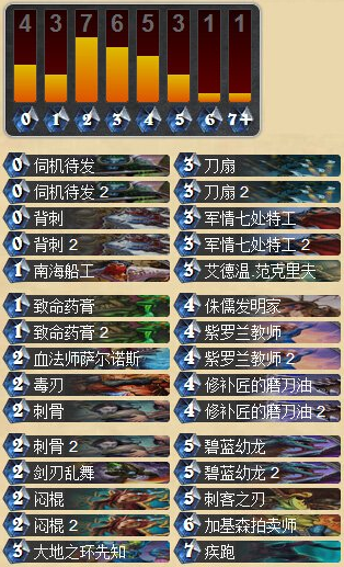 在起手方面,你一般要找背刺、致命药膏和军七特工。这些卡大多数情况下都很棒。对抗那些可能会很早铺场的套牌的时候,比如:中速骑士和机械法,刀扇也是不错的。它让你能够移除那些烦人的前期随从。另外你在前期要巧妙地利用匕首解场。