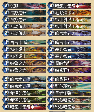 获胜方式:这套卡组的获胜方式和黑暗大法师类似,就是前期解场+控场然后寻找关键key牌,最后实现一波爆发,不过和其他OTK卡组不同的是,这套卡组的斩杀方式确实让人匪夷所思。卡组的最终OTK斩杀牌一共有9张,暗影打击装甲X2,纳鲁之光X2,活动假人X2,狂野炎术师X1,治疗之环X2,一共需要8费,所以你还有2费可以用一个英雄技能。