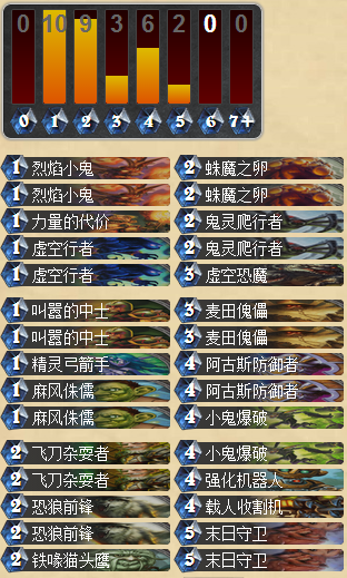 这套动物园在对抗目前天梯上较多的机械法、中速猎以及咆哮/土豪德时都有着还不错的胜率(打中速骑55开,看起手和神抽)。大家可以注意到这套动物园相比一个月之前的版本去掉了因为砰砰博士的存在而很容易躺枪的海巨人。另外作者同时也建议如果一下子遇到了很多刀油贼的话建议停排一段时间。