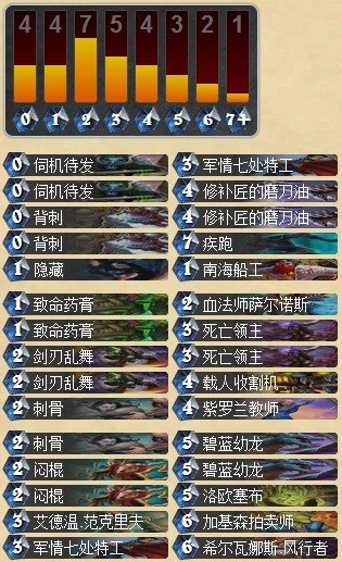 首先是看到就可以留的牌,不论对战职业---0费的背刺,1费的致命药膏,3费的军情七处特工。这3张牌可以保证3费的解场和站场。对于节奏的把握至关重要。尤其是盗贼后手,有了硬币2费跳军情七处特工,是极大的赚卡差和节奏的combo。
