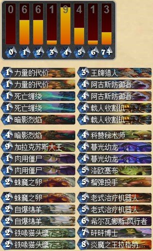 顺带说下:这套卡组主要是尝试在早期控制局面,然后用一些高质量的随从交换(载人收割机,暮光幼龙,榴弹投手)我选择橙卡的方式是根据6-9费的曲线来的。(加拉克苏斯大王在对抗猎人的时候真的很好用)