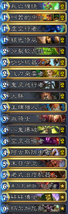 首先天梯大热门机械法:基本9-1开 主要上分对象 起手直接走动物园路线 找低费站场仆从 叫嚣必留 小鬼爆破必留 血骑士必留 接下来就跟机械法抢场面吧 在叫嚣的以小换大能力以及各种亡语站场的情况下 机械法甚至根本没有呼出来的机会 中期能大胖buff一波最好 没有也根本不影响大局