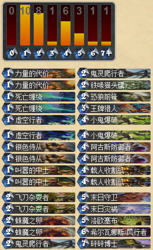 大多数情况下你需要起手找虚空行者,圣盾11,鬼灵爬行者,蜘蛛蛋。如果已经有了其中之一的话你可以留叫嚣。只有在打猎人的时候,如果我起手没有这些牌我也会留叫嚣。