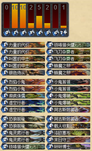 也就是说在选牌阶段你需要选择那些前期随从。你需要的卡牌有银色侍从,烈焰小鬼,麻疯侏儒,以及虚空行者这类可以配合鬼灵爬行者,飞刀杂耍者,蛛魔之卵和小鬼首领一起使用的随从。对手肯定没有足够的办法解决你一波又一波的随从,特比是当你大量的小鬼和飞刀杂耍者共同发挥作用时更是如此。由于这套卡组当中的大量随从,你的阿古斯防御者总会找到使用的目标,而像蛛魔之卵和载人收割机这样的随从使其效果更加出色了。