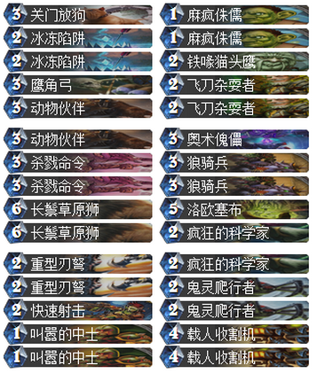 第三套是猎人,是用这套在这个月顺利上了传说,并在今天冲到了前100。也发现现在的T7少了很多,大家很多都在用这种相似的猎人。确实牌组很强,加强的战场,适当的陷阱压制。个人感觉,起手有小蜘蛛和小武器,基本胜利在手。