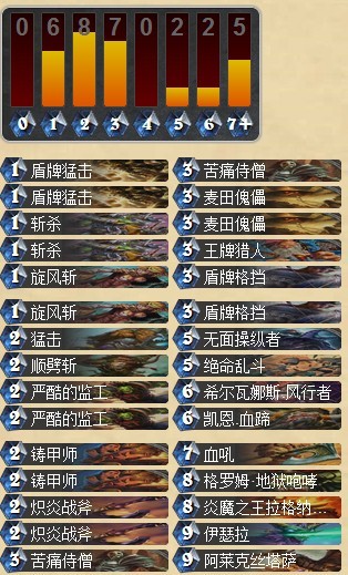 术士:我的大概胜率只有一半,其实打术士胜率挺高的,对动物园起手能换到小斧子顺劈麦田之类的基本就拿下了,打大王术留盾猛斩杀也简单,但是我一般起手留的解动物园的牌(毕竟多) 结果留了这堆牌之后出来个大王术,巨人啥的一上手里没盾猛斩杀就基本走远了。