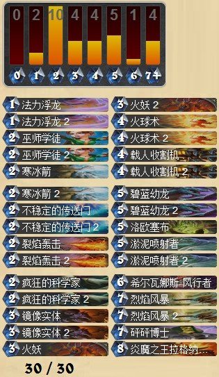 上个赛季,我只用了火妖法一套牌就上了传说,使用的方法就是不断根据我当天遇到的对局修改套牌;举例来说,当变速猎刚开始火的时候, 我在套牌中加入了科赞秘术师和变形术来对付冰冻陷阱和长鬃草原狮。最终我在当天以面对变速猎6-2的成绩成功登上传说。