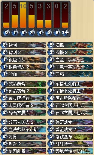 卡组全程走的都是控制路线,打的是防守反击,加入了诸多对敌人法术产生限制的优质随从,最大限度上避免了对手的香蕉发挥作用。盗贼前期优秀的解场能力也能够最大化的降低香蕉的价值,背刺、毒药等,包括军情七处特工的连击效果,都能抢占节奏,而前期的费用异常紧张,对手手中的香蕉除了卡手再没有第二个用途。中后期我们各种穴居人能够发挥作用,持续的对对手的法术进行控制。卡组中加入了银色侍从和血色十字军,它们的圣盾能够很好的保证站场,香蕉的使用也可以让它们躲避开对手英雄技能的范围,避免被赚得卡差,卡组中还加入了一张冷血,配合圣盾生物使用非常凶悍。