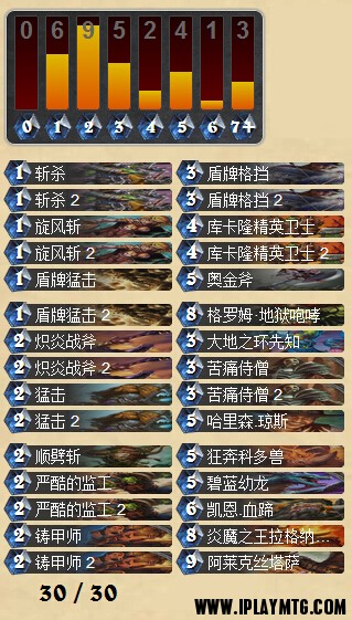 而现在,战士已经属于第三阶梯了,他依然拥有对抗其他控场卡组的优势,依靠强大又低费的去除法术。盾牌猛击和斩杀在对抗高质量随从效率非常高,而炽炎战斧也能帮助战士清理小随从。