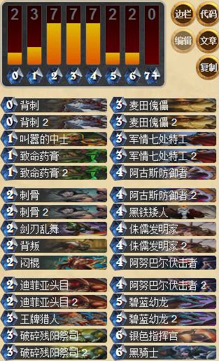 构筑思路:加入大量战吼类随从,免除阿努巴尔伏击者的负面效果,充分发挥其身材上的优势。