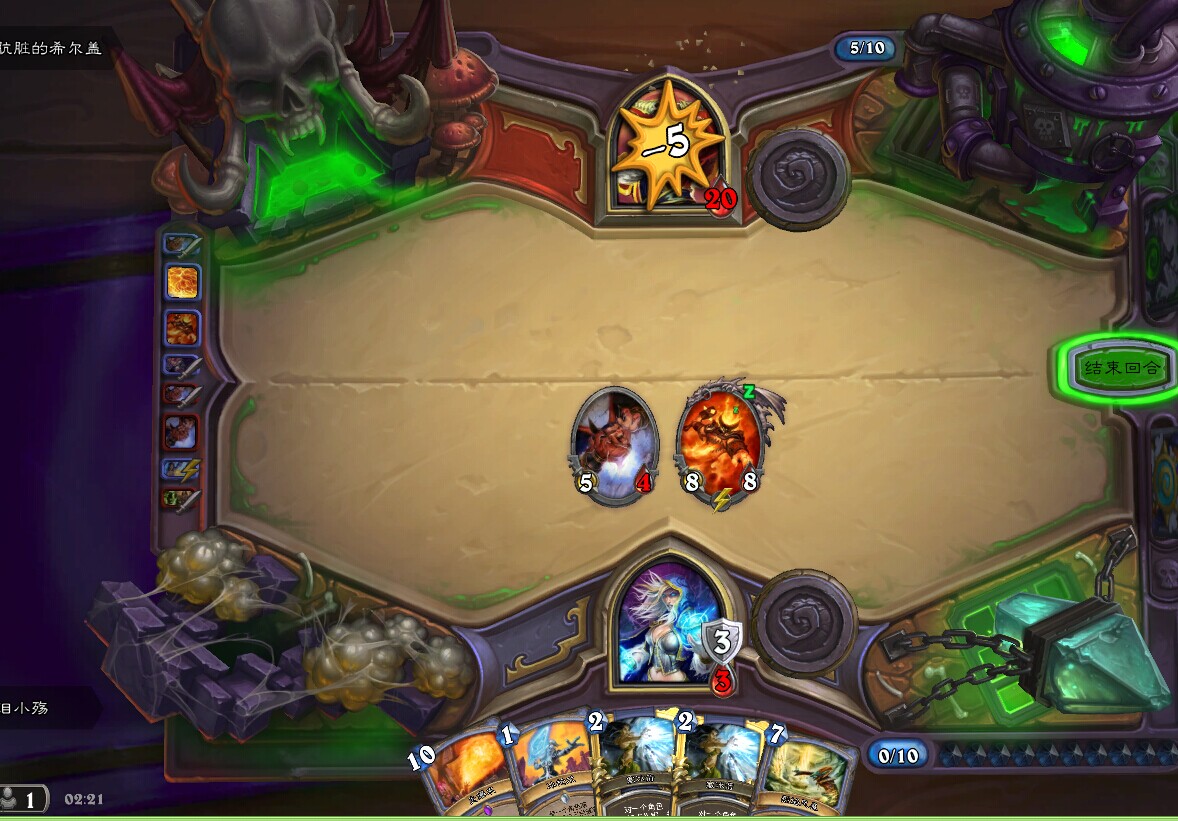 3:BOSS有 一个‘魔爆术’全场伤害1,和‘对单体5伤害’和‘剧毒之种’3张法术卡,玩家要做的就是在‘魔爆术’之后下随从拿+8攻击的BUFF。