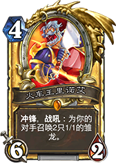 火车王:7费可以配合冰环,遇到对面上中大型嘲讽随从也可以直接换掉。这里有个火车王的小窍门:在对阵德鲁伊、骑士、动物园等这些无法解自己随从的职业,2个雏龙可以起到占位置的效果。造成德鲁伊不能上知识古树回血,动物园上不了末日守卫,骑士无法使用列王守卫,有时甚至可以起到控制场攻的作用。