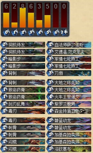 14级之前我按印象组了套,加了一张冷血一张隐藏,还抱有斩杀的幻想,打的不顺,去掉冷血后就开始连胜80胜率轻松5级,然后胜率降了,但上3级。恰逢瓦莉啦的帖子出来,我一看怎么没带血法,于是两张毒刃下一张换血法,这下可好,直接掉级,然后在3级徘徊。于是下血法上毒刃,打到二级。回去想了一下,决定再下隐藏,还是加血法,形成最终卡组,用这套卡组从二级开始11-1上传说52,8-1上传说10。输到14,再升5。