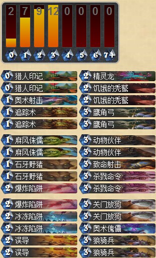 鹰角弓:或许这是这套卡组中最重要的一张牌。如果你能设法在早期就使其上场和奥秘一起作用可以为你提供大量伤害,即可快速杀死对手又可以保护自己的随从。如果你在天梯上发现很多人用酸性沼泽软泥怪或哈里森·琼斯,那么你就要三思而后行了。