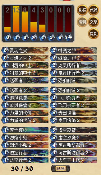 最后,是NAXX后的目前比较流行的亡语虚空恐魔术士。这类目前已经占据各种主流,其中飞刀配合12亡语蜘蛛和其他亡语仆从可以打出伤害配合,送葬者前期打出配合瞬间巨大优势,加伤害的配合蜘蛛蛋直接44站场,力量代价解场召44两不误还能配合虚空恐魔,虚空恐魔不管是吃叫嚣的怪还是力量代价都能巨大化,再有力量代价更是无情,再者吃蛋召44也是绝技。稳定性强而且克服了中前期职业易被AOE一波清场打崩的缺陷,但是缺点就是易被拖入中后期职业的节奏,之后就万劫不复了。但是一旦有小配合打成就可以直接占据胜局。38嘲讽还是饱受争议的,依据个人喜好而带。推荐卡送葬者、麻风侏儒、12亡语蜘蛛、蜘蛛蛋、麦田傀儡、叫嚣中士、阿古斯、火车王。