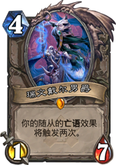 点评:瑞文戴尔男爵的致命缺陷就是身材,如果说费尔根兄弟是在擦饮水机的话,那么瑞文戴尔男爵就是在坐冷板凳了,虽然这张牌确实有很多玩家试图加入卡组,而且笔者也在天梯中见到过这张牌很多次,但是从效果上来说确实不尽人意。也许是目前的亡语流派体系还不够成熟的原因,这张牌的应用范围十分狭窄,不过可以设想有朝一日亡语流突然横行,那么这张牌一定是关键牌,所以说男爵毕竟是男爵,虽然坐着冷板凳,但是潜力还是有的。