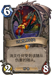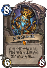 点评:再怎么说克总还是“总”,作为纳克萨玛斯的终极BOSS,给予的奖励自然也是差不了。这张牌可以说是稳定局势,奠定胜局的神卡,虽然在劣势情况下翻盘有点困难,但是上场不亏还是可以做到的。最近茫茫多的转生萨满以及救赎圣骑士套路都是围绕这张牌进行构造,虽然现在的体系并不完善,但是相信大家都看到了克总的潜力所在,被沉默了不亏,也不会被王牌猎人毙掉真是一个难解的家伙,和弗丁有一点点相似。