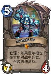 点评:刚刚获得奖励的时候感觉收到两张橙卡好开心,但是到目前为止这两兄弟的出场率应该说是这次冒险模式所奖励橙卡中最低的了。这两兄弟是暴雪在炉石这种卡牌游戏机制上的一种创新吧,之前炉石中从没有类似需要两张单卡这样配合的机制。不过费尔根的身材还是很不错的,斯塔拉格由于攻高血低而且进入了王牌猎人的射程而不被看好。虽然费尔根的身材好,但是谁会在五费带上这张白板呢?五费有洛欧塞布、淤泥喷射者、碧蓝幼龙等等值得带的单卡,就算动物园的大哥也是五费必备,虽然恶魔术士可以依靠虚空恐魔吃掉这两兄弟,一回合做出两个塔迪乌斯,想法不错但是这太难办到了,所以在开发出全新的流派之前,这两兄弟只能继续一起擦饮水机了。