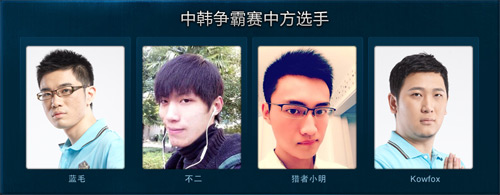 《炉石传说》中韩争霸赛于2014年3月在上海展开,经过了2天4场的精彩比赛,中国队以3比1的大比分取得胜利,中国的四位参赛选手Kowfox、猎者小明、不二以及蓝毛在比赛中的精彩表现至今被人们津津乐道。