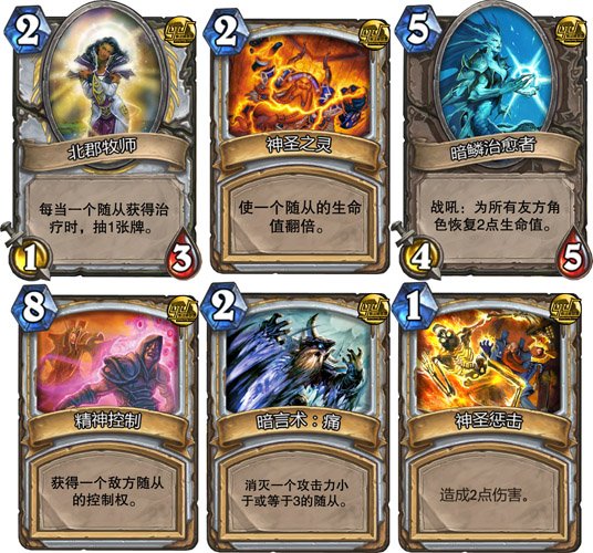 1.牧师的核心是北郡牧师,这张2费的仆从能帮你抓好多的牌。你要尽量保护好这个引擎。很多时候给她用神圣之灵生命翻倍也是不错的。