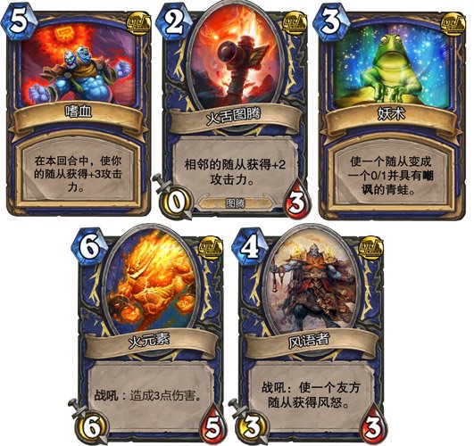 2.火舌图腾是非常厉害的卡,合理利用相邻的功能,可以让一个与他相邻的仆从主动换掉对手的仆从,那么这个死了的仆从的右侧仆从会自动挤过来然后得到+2攻击的buff。合理应用乐趣无穷。