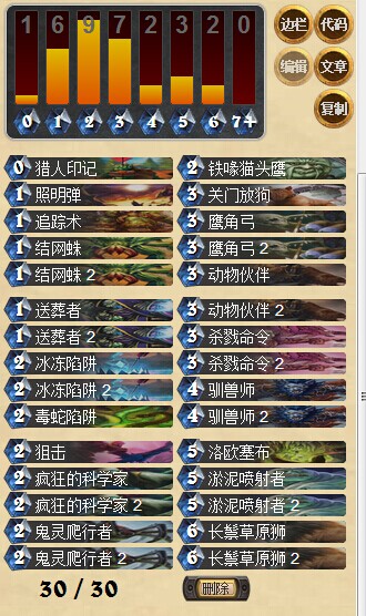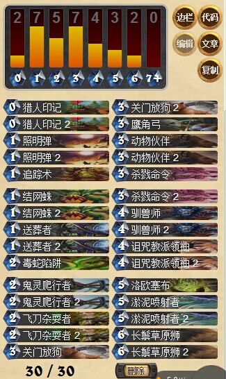 首先,卡组的基本构造是送葬者、织网蛛、鬼灵爬行者,还有中速猎德一群常规法术仆从。因为带了**刀和双洗脚,所以双放狗是必须的。中速猎对于过牌的需要是比较强的,所以一旦手牌很空,会出现很不爽的,加上天梯中猎人依然非常之多,所以双照明弹还很有必要,万一遇到个奥秘法可以完全吊打。作为飞刀猎人,会感觉毒蛇陷阱很赚,但是现在天梯环境导致对方猜牌很容易猜到自己的奥秘是毒蛇陷阱,所以想用飞刀吸引到火力赚射击的几率小于三成。毒蛇陷阱带一个足够,因为我们是没有带疯狂科学家的,毒蛇陷阱只能是我们主动地挂上,挂的时机当然是选择在有董大师,或者是米莎,还有驯兽师架起嘲讽的东西的时候最好。