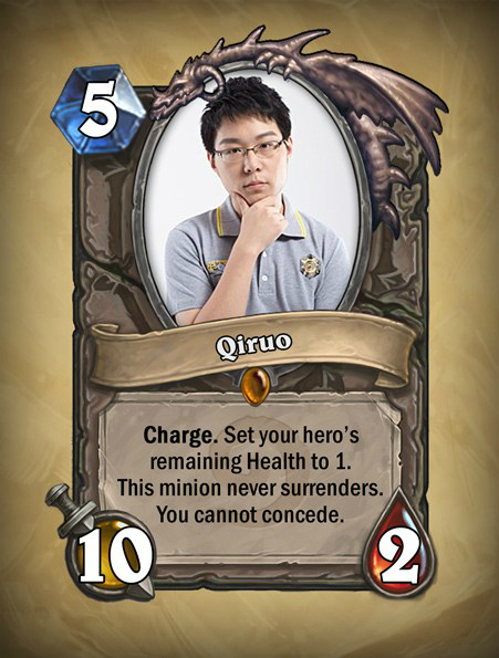 Qiruo(七若) 5费 10/2 冲锋。使你的英雄的生命值变成1.这名随从永不投降,你绝不能让步。