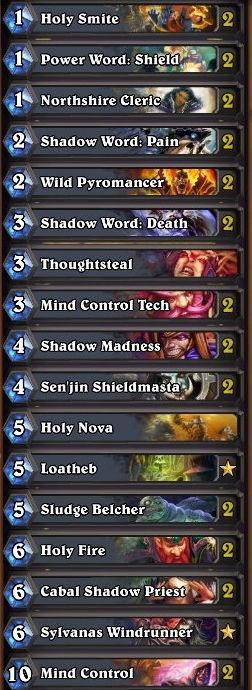 这个卡组的整体思路就是通过控制或消灭对手随从打击对手,劝降他们。面对快攻卡组时,我们有两个炎术士,两个狂乱,两个精神控制技师,一个神圣新星。面对控制类卡组时,想办法制造控制他们随从的机会,因为控制类卡组开始不会下太多随从。如果你的局面很危险,你还有机会等你的对手用光他的牌,他会被烧死,而你还可以治疗自己。你要注意的是不要一味下随从,即使你有费。每一张牌都有他们独特的作用,你需要充分地理解和应用。另外,要多奶自己,保持健康,使对手无法斩杀你,当然,也要奶随从。