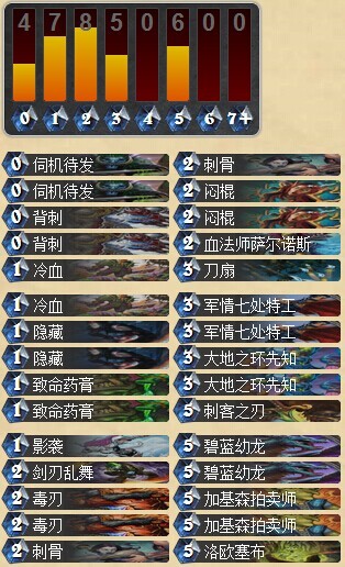 在我具体谈到如何使用这套卡组中的卡牌前,我希望说一下没有被我选入其中的卡牌。范克里夫是一张很好的橙卡(特别是在有两张隐藏的卡组当中)而 我最初也把范克里夫放到了这套卡组里。不过当我进行实际测试后,我放弃了范克里夫,因为他经常会迫使你用出一些不是最优选择的卡牌。这张卡牌有时候确实可 以为你带来帮助,但是更多的情况下,他可能会成为你的负担。奇迹贼最经典的获胜方式就是在某一轮打出自己全部的爆发。因此,我们需要放弃范克里夫。