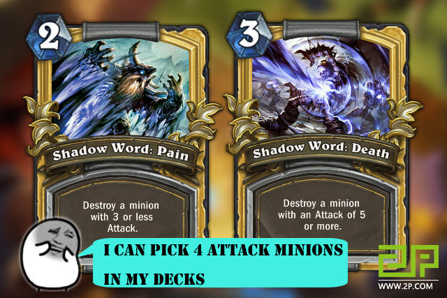 然后在看看暗言术:痛和暗言术:灭,虽然无法消除攻击力等于4的随从,但它们已经很有效的限制了对手的行动。牧师的神圣之灵和心灵之火可以轻而易举地创造出可怕的压制性的怪物(特别是用在古拉巴什狂暴者,魔古山守护者等随从的身上时)。