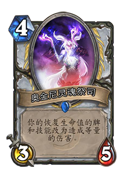 9、奥金尼灵魂祭司 在场,英雄血量低于15时,对该英雄使用红龙阿莱克丝塔萨的加血效果会对应转变为伤害效果。比如英雄血量为7点,使用红龙调整其血量至15即可理解为加8点血,若此时你的奥金尼灵魂祭司在场,即会对该英雄造成8点伤害而将其秒杀。
