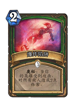 10、来看下猎人的奥秘,爆炸陷阱 :(奥秘)当你的英雄受到攻击,对所有敌人造成2点伤害。但是爆炸陷阱无法被战吼伤害(如精灵弓箭手战吼),法术伤害(如奥术射击)以及英雄能力(如法师的火焰冲击)触发,通常只能在对手武器或随从攻击时才能触发。