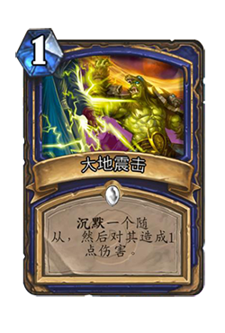 13、萨满的法术卡 大地震击 是先对目标进行沉默,然后造成1点伤害。所以你可以用它来直接秒杀圣盾加身的银色侍从、血色十字军战士,或是其他被血量BUFF后的1血随从,甚至包括暮光幼龙。