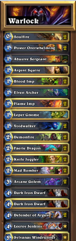 Chakki:这是我现在使用的术士卡组,但更新补丁后我还没有玩过,所以我可能会改变一些东西。它的确可以被改变,我已经试了一些不同的变化。疯狂的炸弹人可能去掉因为他们最近一直不如人意。