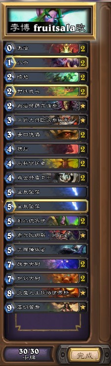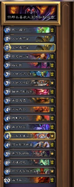 最后为我从1级3星打到传说连胜3盘的功臣也正是这套卡组。我并不建议两位数等级的朋友选用这个卡组,因为这种级别是可以通过土豪德这样的卡组把命运掌控在自己手里。但强烈推荐感觉打到瓶颈无法突破的玩家用这套试一试手气——前段的玩家应该都体会过一段时间的强运给自己偷来的一波连胜有多酣畅淋漓。